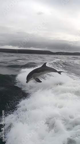 Fototapeta premium A dolphin leaps above ocean waves, showcasing its agility and playful nature.