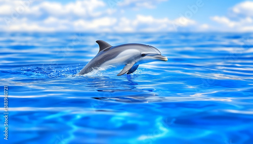 Naklejka premium A dolphin leaps from the ocean, its sleek body glistening, against a backdrop of vibrant blue water and a partly cloudy sky