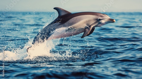 © Viktor, Fototapeta premium A dolphin leaps from the water, its mouth agape and head clear of the surface