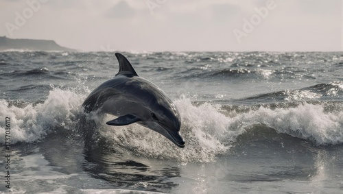 Fototapeta premium A dolphin leaps gracefully out of a choppy ocean