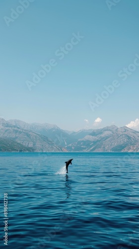 © lililia, Obraz premium A dolphin leaps high out of the water during a performance in a pool.
