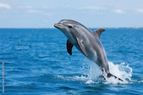 Fototapeta premium A dolphin leaps out of the ocean, creating a splash against a clear blue sky.