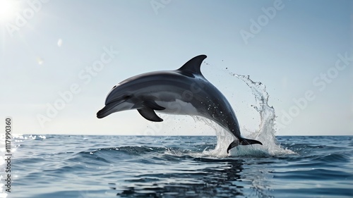 © Muhammad, Fototapeta premium A dolphin leaps out of the water with bright sky behind