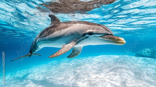 Fototapeta premium a dolphin swimming beneath a transparent layer of ocean ice, captured from underneath, ice textures and light distortions visible, clean high-contrast blue tones