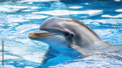 © BerkahStock, Naklejka premium A dolphin swimming gracefully in clear blue water.