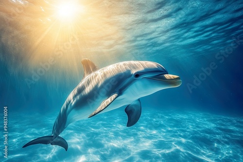 © Wan, Fototapeta premium A dolphin swimming gracefully in clear blue water, illuminated by sunlight above.