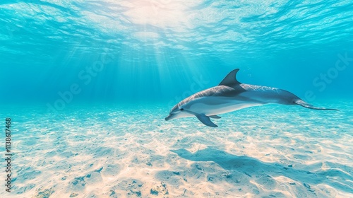 © MetaKibo, Obraz premium A dolphin swimming gracefully in clear blue water with sun rays above.
