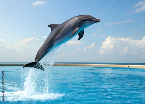© Yauhen, Obraz premium A dolphin swimming in a blue pool with a blue sky in the background.