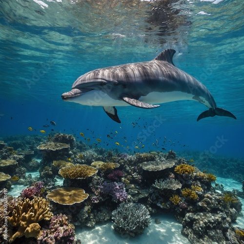 © Atif, Fototapeta premium A dolphin swimming in crystal-clear water, with colorful coral reefs below.