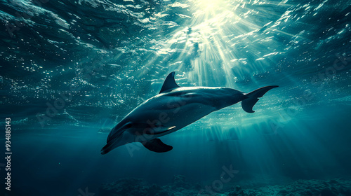 © creative, Obraz premium A Dolphin Swimming Through Sunbeams in the Ocean