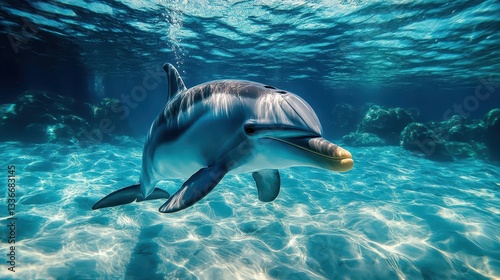 © Blackmint Studio, Fototapeta premium A dolphin swims elegantly through the clear waters of a tropical ocean, its playful nature on full display as sunlight dances on the surface, illuminating the underwater habitat