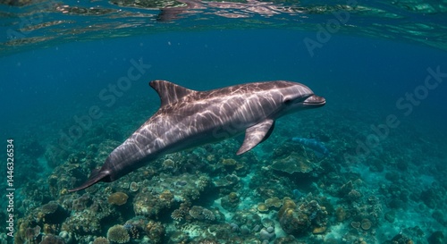 Fototapeta premium A dolphin swims gracefully over a vibrant coral reef in clear turquoise ocean...