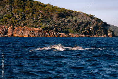 © Gary, Fototapeta premium A dolphin swims near the surface with a scenic island in the background.