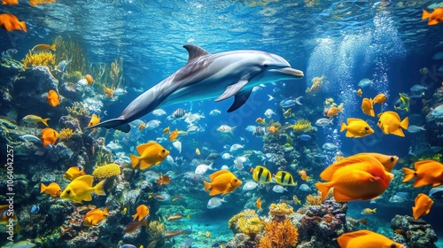 Fototapeta premium A dolphin swims through a vibrant coral reef, surrounded by colorful fish.
