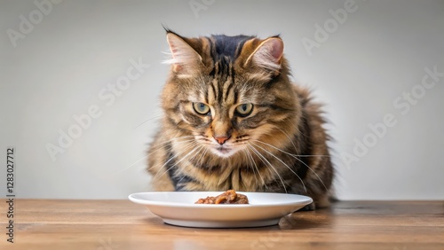© Praphunsak, Naklejka premium A domestic cat sits in front of a plate with a meal spread out before it