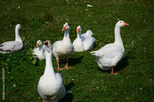© maria, Obraz premium A domestic gooses on the lake at sunny day