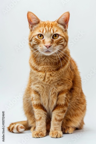 Obraz premium A domestic orange cat sitting comfortably on a white background