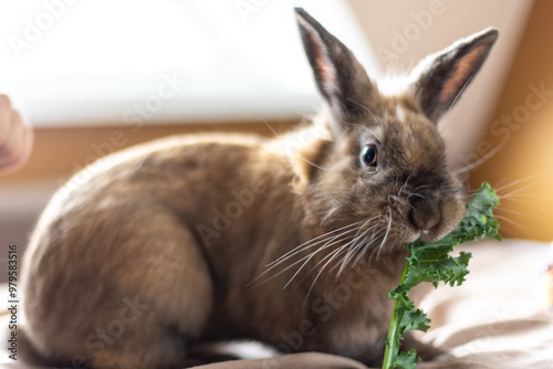 © puhimec, Obraz premium A domestic rabbit eats cabbage. Pet concept.