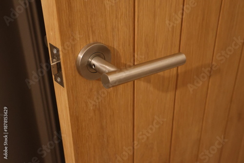 © Stanislav, Obraz premium A door handle is shown in a wooden door