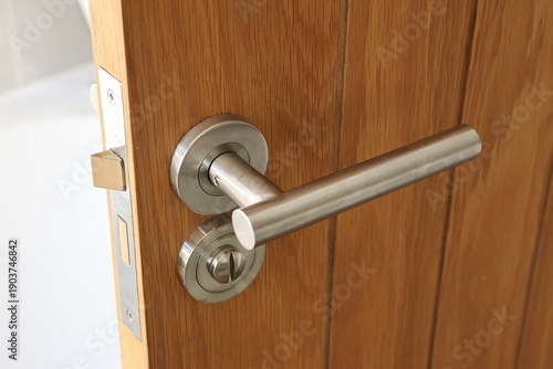 © Stanislav, Obraz premium A door handle is shown in a wooden door