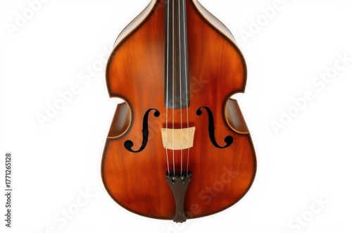 © Michael, Fototapeta premium A double bass with tall wooden body, arched shoulders, strong bridge, and four strings, shown in full with smooth varnish and crafted details. Generative AI