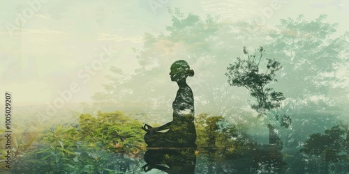 Fototapeta premium A double exposure image of a person meditating, with a serene natural...