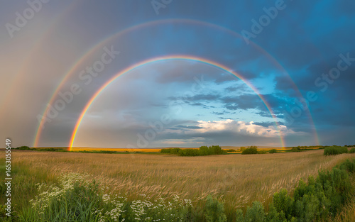 © Waqar, Naklejka premium A double rainbow over a field under a cloudy sky at daytime