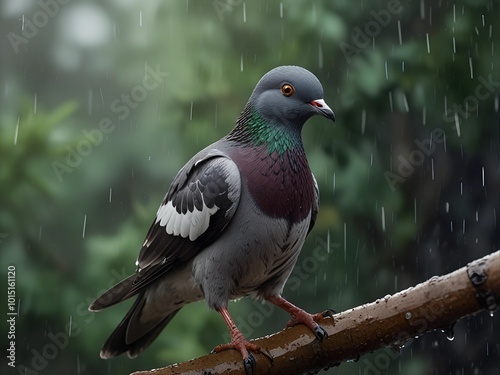 © Nuri_Moon, Fototapeta premium A dove sits on a branch caught in the rain AI generated