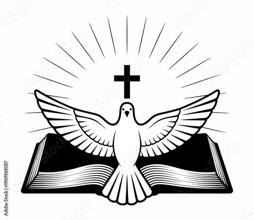 Fototapeta premium A dove spreads its wings above an open book, symbolizing peace and wisdom