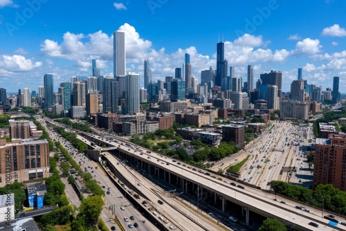 Fototapeta premium A downtown skyline with towering skyscrapers and busy streets below, showcasing the energy and density of urban life