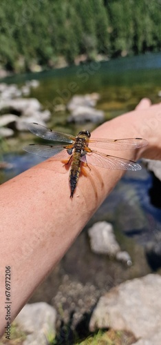 © Michaela Holubová, Obraz premium A dragonfly, a marvel of the insect world, graces the air with its iridescent wings and agile flight. With a body as delicate as it is resilient, the dragonfly maneuvers gracefully, showcasing its int
