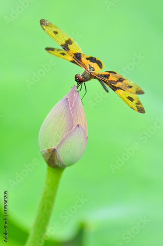 © James Zhu, Obraz premium A dragonfly(Rhyothemis variegata arria) perchs on leaf in the sun.