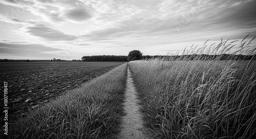 © Mr. Stocker, Naklejka premium A dramatic black and white rural scene featuring a narrow footpath separating a plowed agricultural field from tall grass, leading towards a distant treeline under a cloudy sky