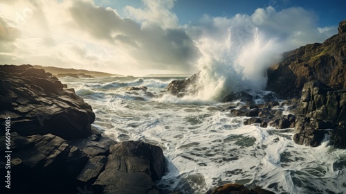 © Cloudyew, Obraz premium A dramatic coastal landscape with crashing waves