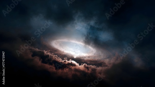 Obraz premium A dramatic cosmic nebula with a glowing accretion disk and swirling clouds