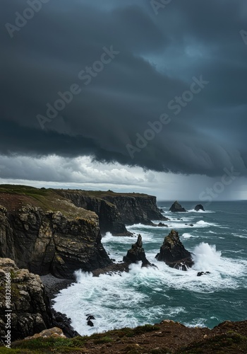 Obraz premium A dramatic dark storm cloud brewing over a rugged, wild coastline where huge...