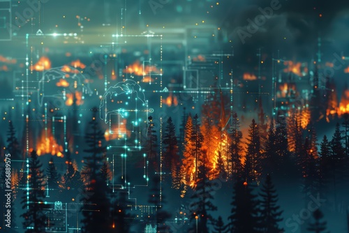 © JK_kyoto, Fototapeta premium A dramatic forest fire scene illuminated by glowing flames, surrounded by a dark, smoky ambiance and digital overlays.