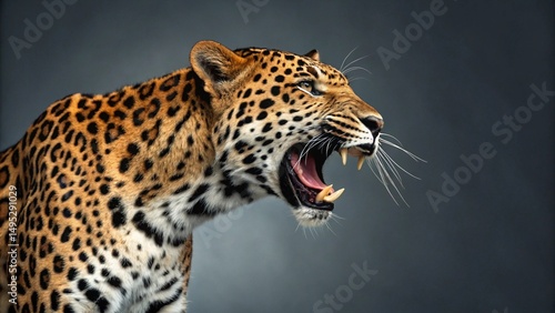 Fototapeta premium A dramatic headshot of a Leopard captured mid-snarl, emphasizing its open...