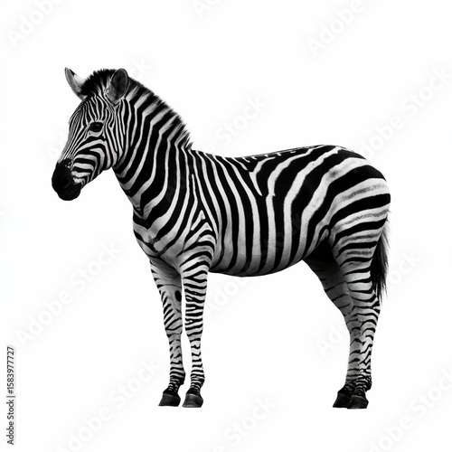 © Act, Fototapeta premium A dramatic, high-contrast black and white portrait photograph captures a majestic zebra standing in profile against a seamless, pure white backdrop
