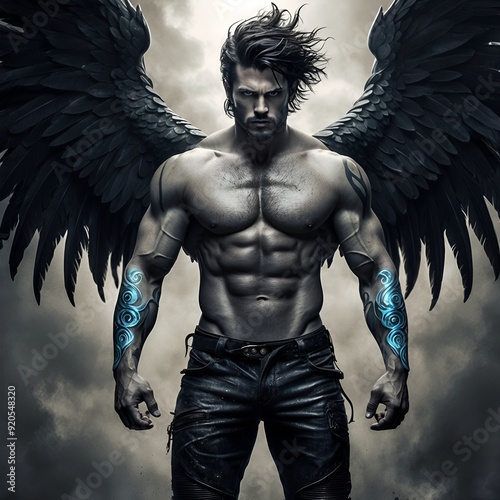 © Muhammad, Fototapeta premium A dramatic, high-contrast photograph of a ruggedly handsome male warrior, standing majestic with imposing wings sprouting from his back, and dark, tousled hair falling across his forehead. His piercin