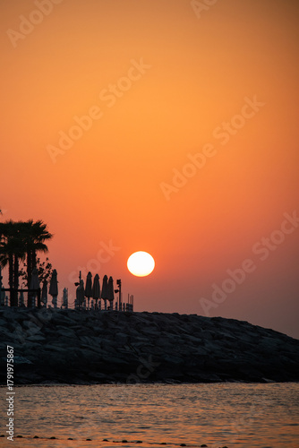 Fototapeta premium A dramatic, intense orange and red sunset or sunrise over the sea, silhouetting beach umbrellas and palm trees on a rocky shoreline
