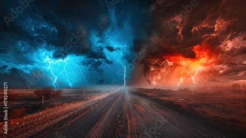 Naklejka premium A dramatic landscape featuring a road under a stormy sky. Lightning strikes illuminate dark clouds in contrasting blue and red hues.