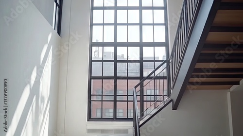 © Pannee, Fototapeta premium A dramatic lighting effect through steel-framed windows in a stairwell