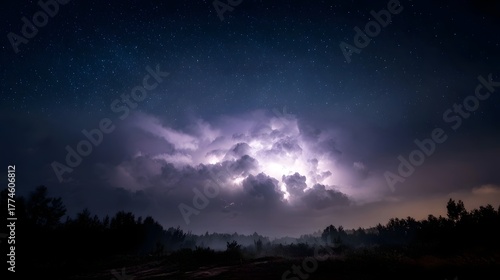 Fototapeta premium A dramatic lightning strike illuminates dark storm clouds against a starry...