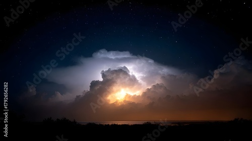 © Thares2020, Fototapeta premium A dramatic lightning strike illuminates the dense storm clouds over the dark ocean horizon under a vast star filled night sky