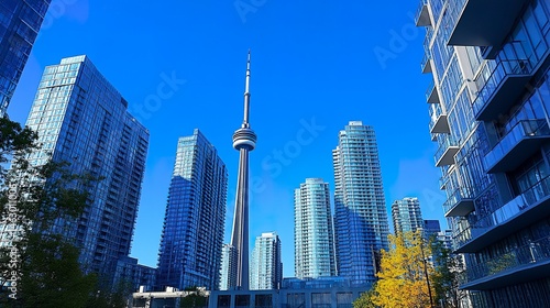 © THUA, Obraz premium A dramatic low-angle view of Toronto's skyscrapers, their sleek glass facades towering into the clear blue sky, showcasing the city's modern architectural brilliance