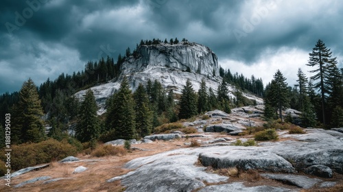 © Zhiandra_Dsgn, Fototapeta premium A dramatic mountain landscape featuring a large, light gray rock face rising dramatically under a stormy sky, with a dense forest of evergreens at its base.