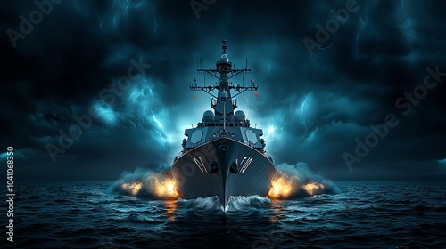 Obraz premium A dramatic naval ship navigating through dark waters, surrounded by ominous clouds and explosions. A striking image of maritime power.