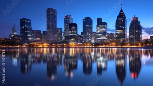 Naklejka premium A dramatic night-time city skyline with a reflective floor, creating a...