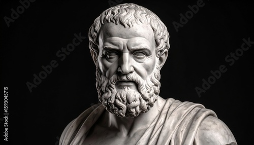 © Lena, Fototapeta premium A dramatic portrait of an ancient Greek philosopher Socrates bust on a dark background, symbolizing wisdom.